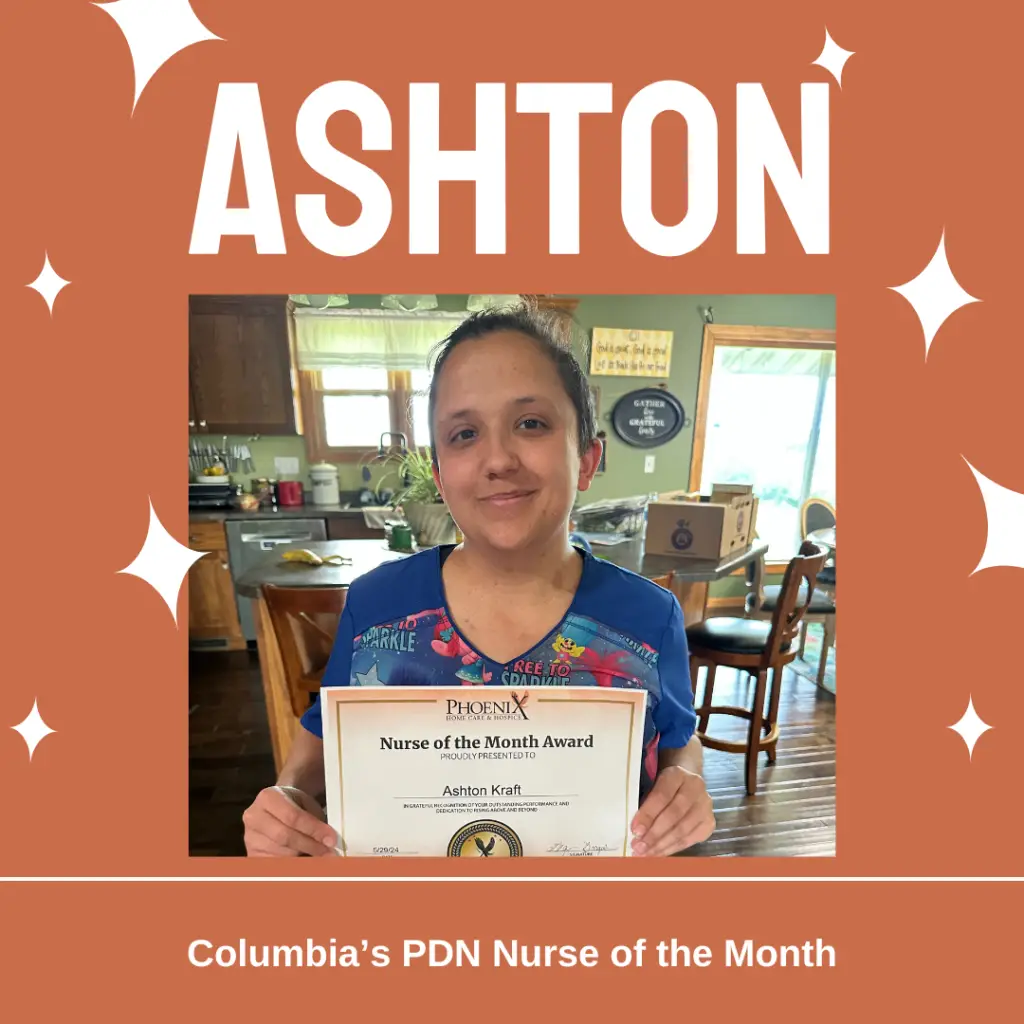Phoenix Home Care and Hospice would like to congratulate Ashton K. on being Columbia PDN nurse of the Month recently!