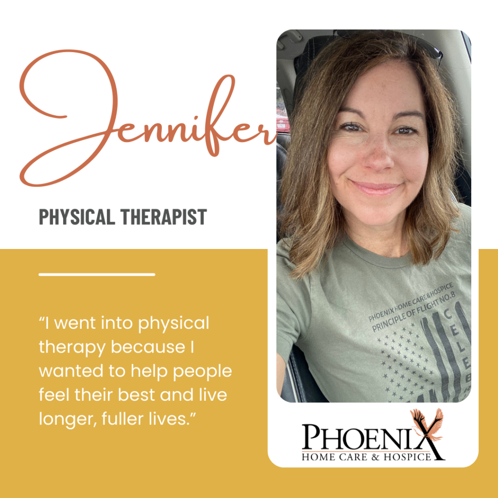 When we asked Jennifer, “Why Home Care & Why Phoenix?” she told us, “As you know, there is no place like home! I believe that people are happier when they are in their home environment, which means higher quality of life. Home care is the perfect answer for merging physical therapy with those who just need a little extra help. I choose Phoenix because they are just good people! We have a great team and everyone supports one another.”