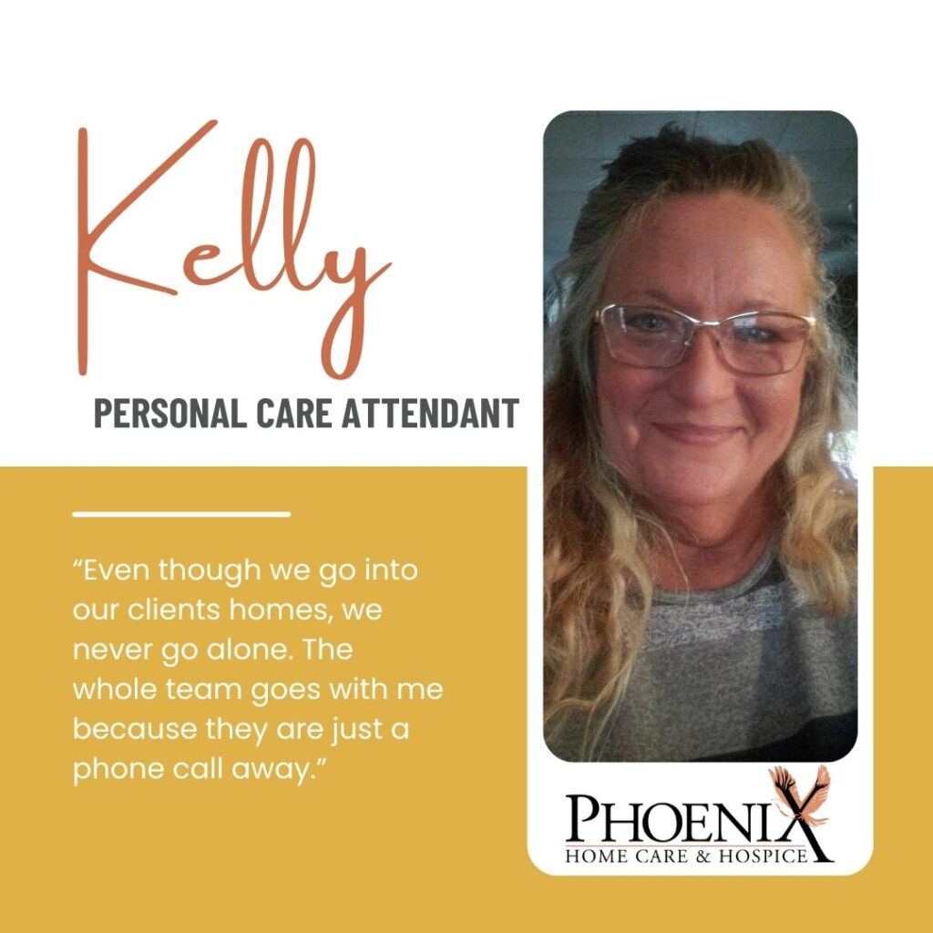 At Phoenix, we strive to exemplify Christ-like values of patience, honesty, and compassion. When asked why she chose Phoenix, Kelly shared, “I worked in home care and facility care for a long time. The lack of appreciation I felt led me to needing a change. I wanted to join the Phoenix Team for the fact of Christian fundamentals it has been founded on. I found a family in Phoenix. I found a staff that cares about our clients and cares about me. They appreciate me and tell me that all the time. That makes a big difference for me!!”