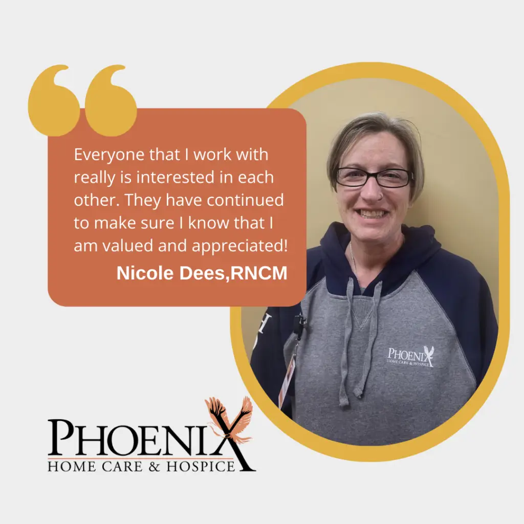 Nicole has been with Phoenix Home Care and Hospice for one year. We asked her, “Why Home Care & Why Phoenix?” She answered, “I used to provide care for oncology services but missed getting to continue following patients once they decided on hospice. I love being around people, learning their history, providing care to assist with their wishes, and to continue their journey to the end of life. Phoenix impressed me with the X-Factor and really focusing on providing assistance for us coworkers and making sure we are able to still focus on our families. I’ve been impressed that our upper management will step up and assist whenever needed, no questions asked.”