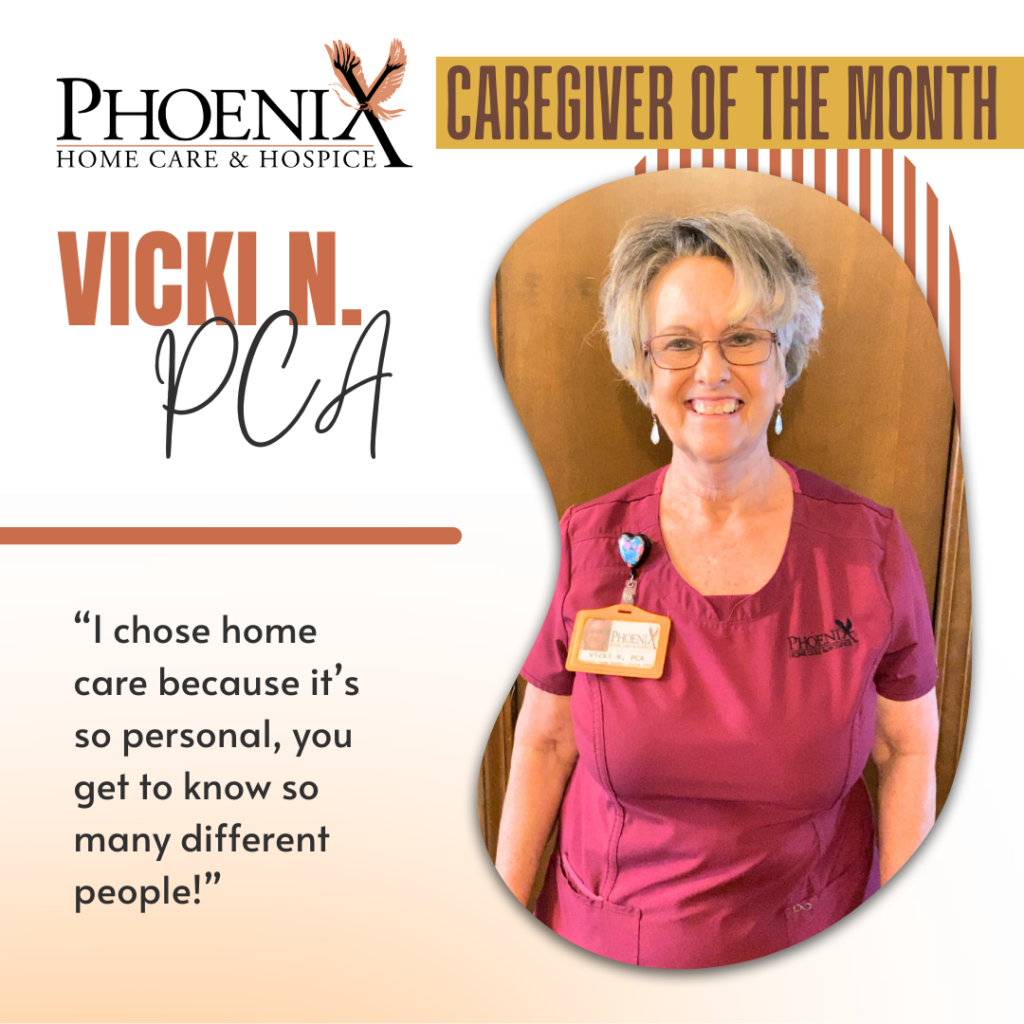 We asked Vicki what she would tell others contemplating working at Phoenix Home Care and Hospice and she said, “You have to have compassion and be very caring to do this job. There are days that aren’t always pleasant, but you just smile, go on, and hope it will be a better day for them tomorrow.”